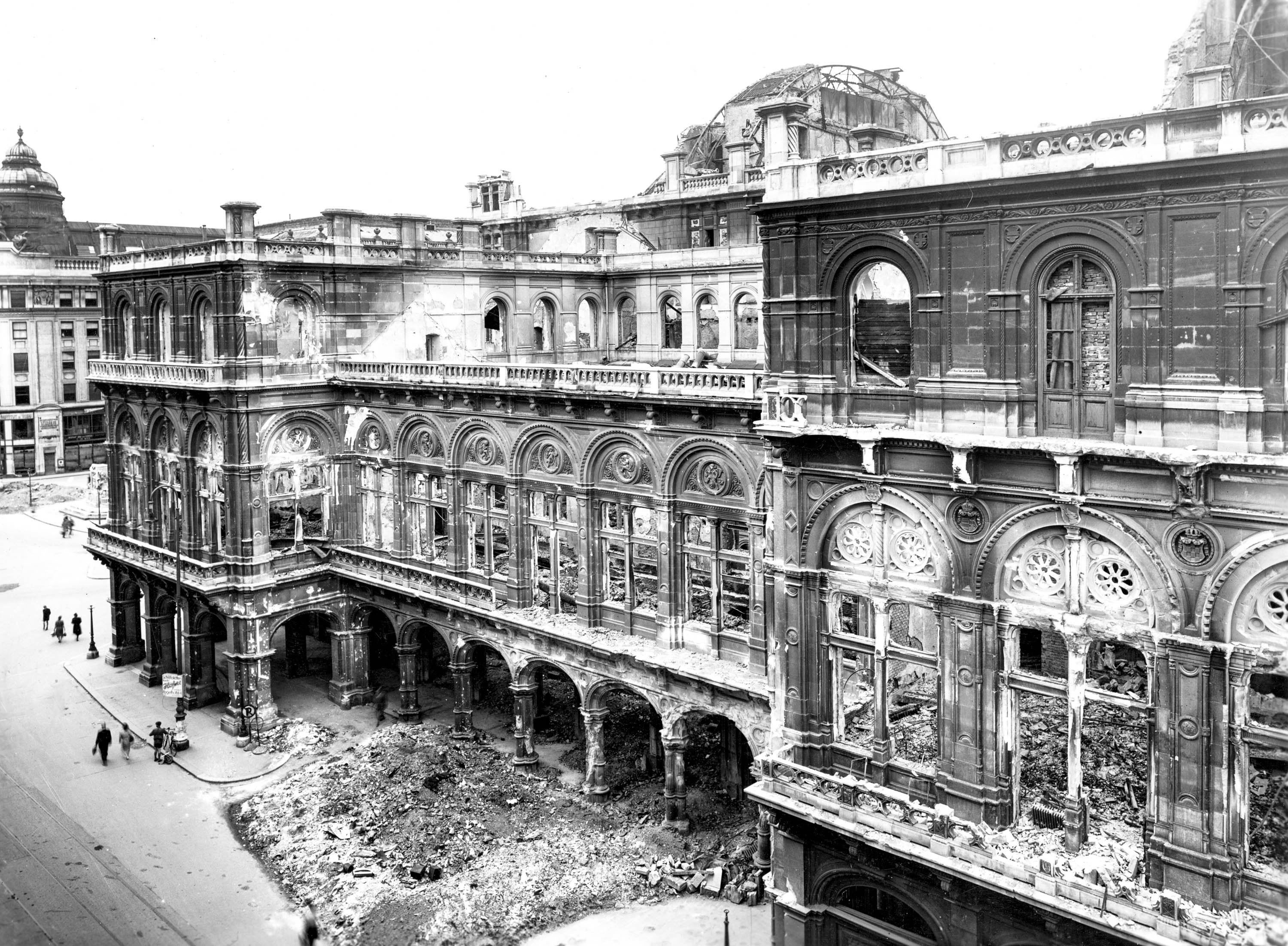 Am 12. März folgte dann eben die Zerstörung. Doch schon knapp zwei Monate später, unmittelbar nach der Befreiung Wiens, wollte man wieder spielen. Also beeilte man sich, einen künstlerischen Notbetrieb zu ermöglichen: In der Volksoper gab die Staatsoper – unterstützt durch die Sowjets – am 1. Mai 1945 bereits wieder Mozarts Hochzeit des Figaro, am 24. Mai 1945 verkündete Staatssekretär Julius Raab den Wiederaufbau des zerstörten Hauses am Ring, am 6. Oktober 1945 eröffnete man als zweites Ausweichquartier das eilig restaurierte Theater an der Wien. In diesen beiden Häusern sollte die Wiener Staatsoper die kommenden zehn Jahre lang spielen.
